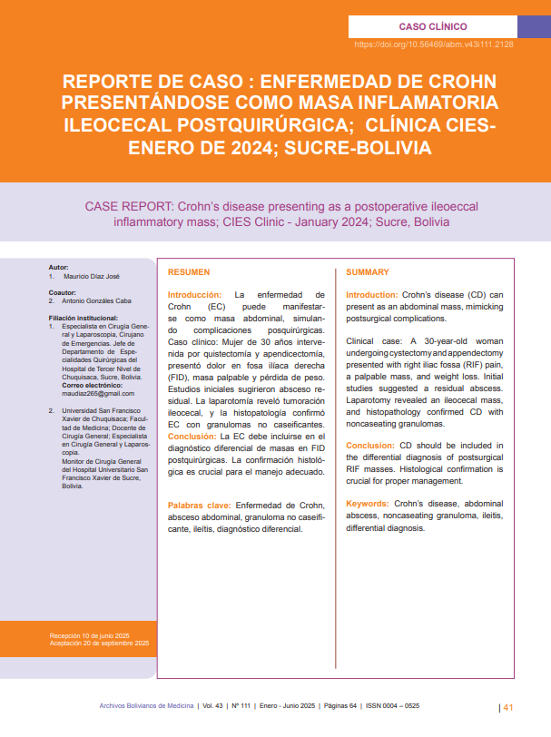 REPORTE DE CASO : ENFERMEDAD DE CROHN PRESENTÁNDOSE COMO MASA INFLAMATORIA ILEOCECALPOSTQUIRÚRGICA; CLINICACIES- ENERO DEL 2024; SUCRE-BOLIVIA