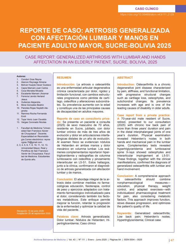 REPORTE DE CASO: ARTROSIS GENERALIZADA CON AFECTACIÓN LUMBAR Y MANOS EN PACIENTE ADULTO MAYOR, SUCRE-BOLIVIA 2025