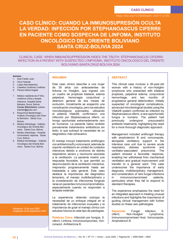 CASO CLINICO: CUANDO LA INMUNOSUPRESIÓN OCULTA LA VERDAD: INFECCIÓN POR STEPHANOASCUS CIFERRII EN PACIENTE COMO SOSPECHA DE LINFOMA, INSTITUTO ONCOLOGICO DEL ORIENTE BOLIVIANO SANTA CRUZ-BOLIVIA 2024.