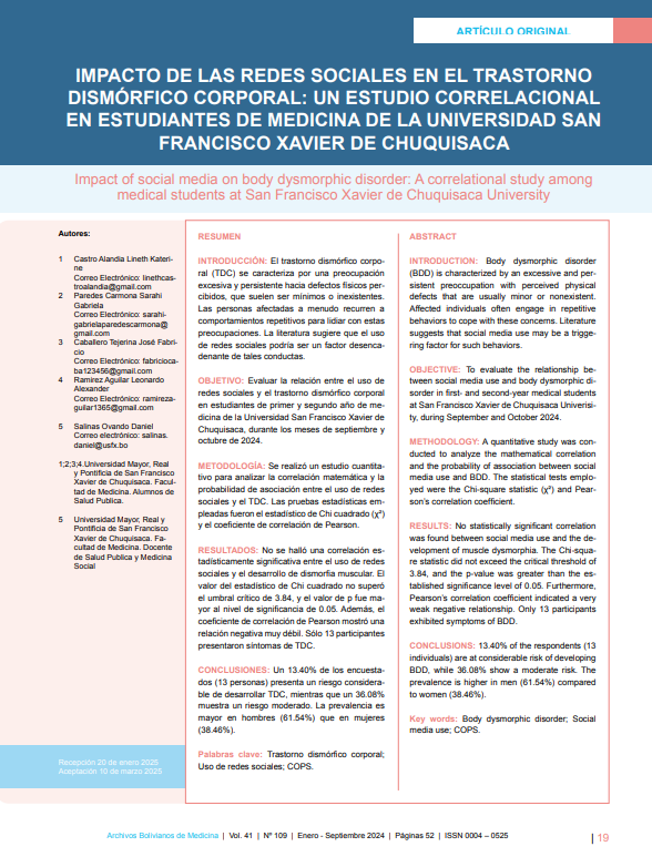 - IMPACTO DE LAS REDES SOCIALES EN EL TRASTORNO DISMÓRFICO CORPORAL: UN ESTUDIO CORRELACIONAL EN ESTUDIANTES DE MEDICINA DE LA UNIVERSIDAD SAN FRANCISCO XAVIER DE CHUQUISACA