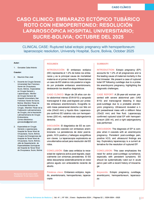 - CASO CLINICO: EMBARAZO ECTÓPICO TUBÁRICO ROTO CON HEMOPERITONEO: RESOLUCIÓN LAPAROSCÓPICA HOSPITAL UNIVERSITARIO; SUCRE-BOLIVIA; OCTUBRE DEL 2025