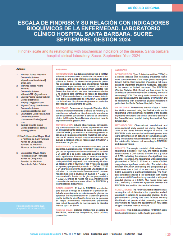 - ESCALA DE FINDRISK Y SU RELACIÓN CON INDICADORES BIOQUÍMICOS DE LA ENFERMEDAD. LABORATORIO CLÍNICO HOSPITAL SANTA BARBARA. SUCRE. SEPTIEMBRE. GESTIÓN 2024