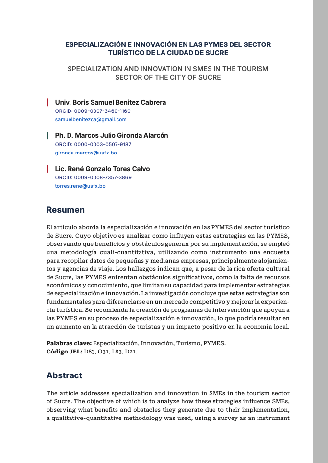 - ESPECIALIZACIÓN E INNOVACIÓN EN LAS PYMES DEL SECTOR TURÍSTICO DE LA CIUDAD DE SUCRE
