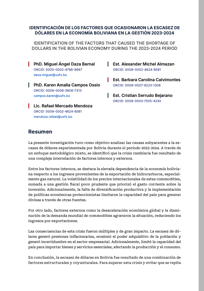 - IDENTIFICACIÓN DE LOS FACTORES QUE OCASIONARON LA ESCASEZ DE DÓLARES EN LA ECONOMÍA BOLIVIANA EN LAGESTIÓN 2023-2024