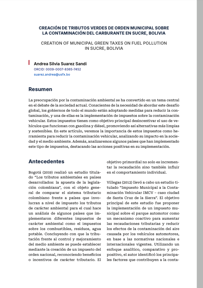 - CREACIÓN DE TRIBUTOS VERDES DE ORDEN MUNICIPAL SOBRE LA CONTAMINACIÓN DEL CARBURANTE EN SUCRE, BOLIVIA