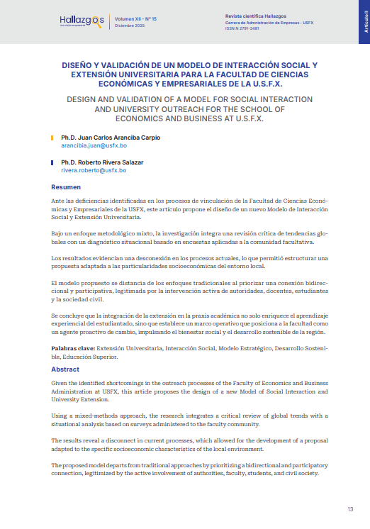 - DISEÑO Y VALIDACIÓN DE UN MODELO DE INTERACCIÓN SOCIAL Y EXTENSIÓN UNIVERSITARIA PARA LA FACULTAD DE CIENCIAS ECONÓMICAS Y EMPRESARIALES DE LA U.S.F.X.