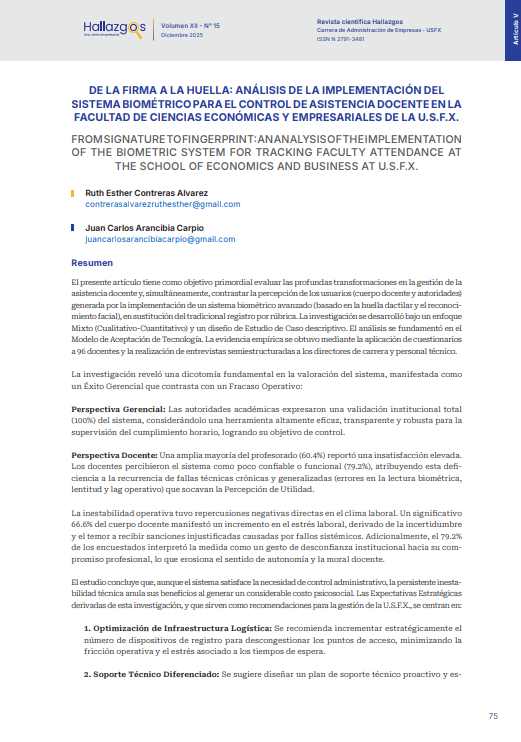 - DE LA FIRMA A LA HUELLA: ANÁLISIS DE LA IMPLEMENTACIÓN DEL SISTEMA BIOMÉTRICO PARA EL CONTROL DE ASISTENCIA DOCENTE EN LA FACULTAD DE CIENCIAS ECONÓMICAS Y EMPRESARIALES DE LA U.S.F.X