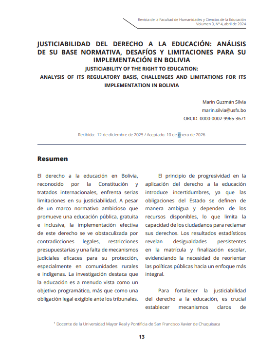 - JUSTICIABILIDAD DEL DERECHO A LA EDUCACIÓN: ANÁLISIS DE SU BASE NORMATIVA, DESAFÍOS Y LIMITACIONES PARA SU IMPLEMENTACIÓN EN BOLIVIA