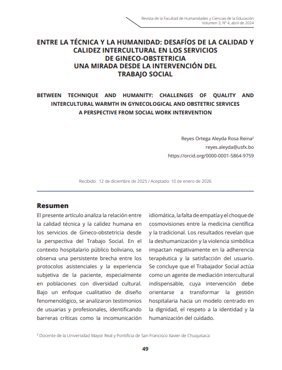- ENTRE LA TÉCNICA Y LA HUMANIDAD: DESAFÍOS DE LA CALIDAD Y CALIDEZ INTERCULTURAL EN LOS SERVICIOS DE GINECO-OBSTETRICIA. Una mirada desde la Intervención del Trabajo Social