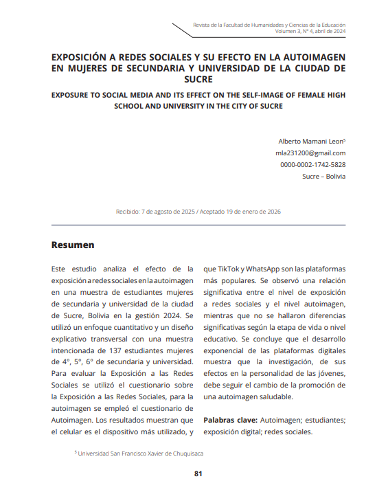 - EXPOSICIÓN A REDES SOCIALES Y SU EFECTO EN LA AUTOIMAGEN EN MUJERES DE SECUNDARIA Y UNIVERSIDAD DE LA CIUDAD DE SUCRE