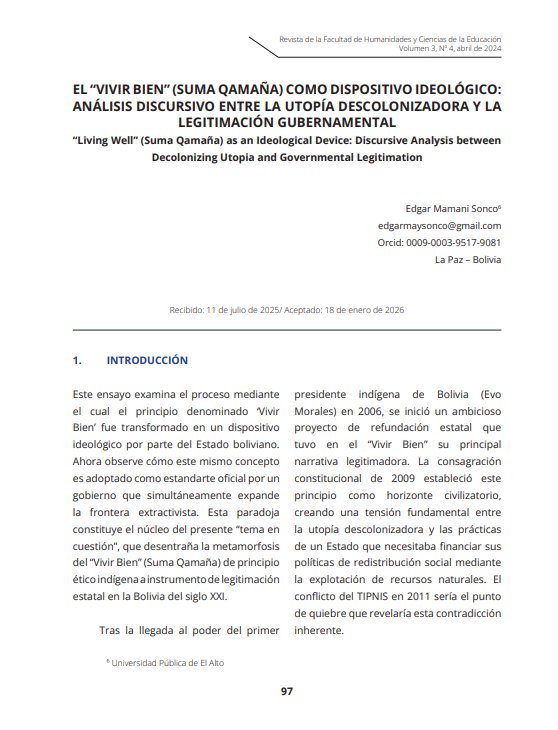 - EL “VIVIR BIEN” (SUMA QAMAÑA) COMO DISPOSITIVO IDEOLÓGICO: ANÁLISIS DISCURSIVO ENTRE LA UTOPÍA DESCOLONIZADORA Y LA LEGITIMACIÓN GUBERNAMENTAL